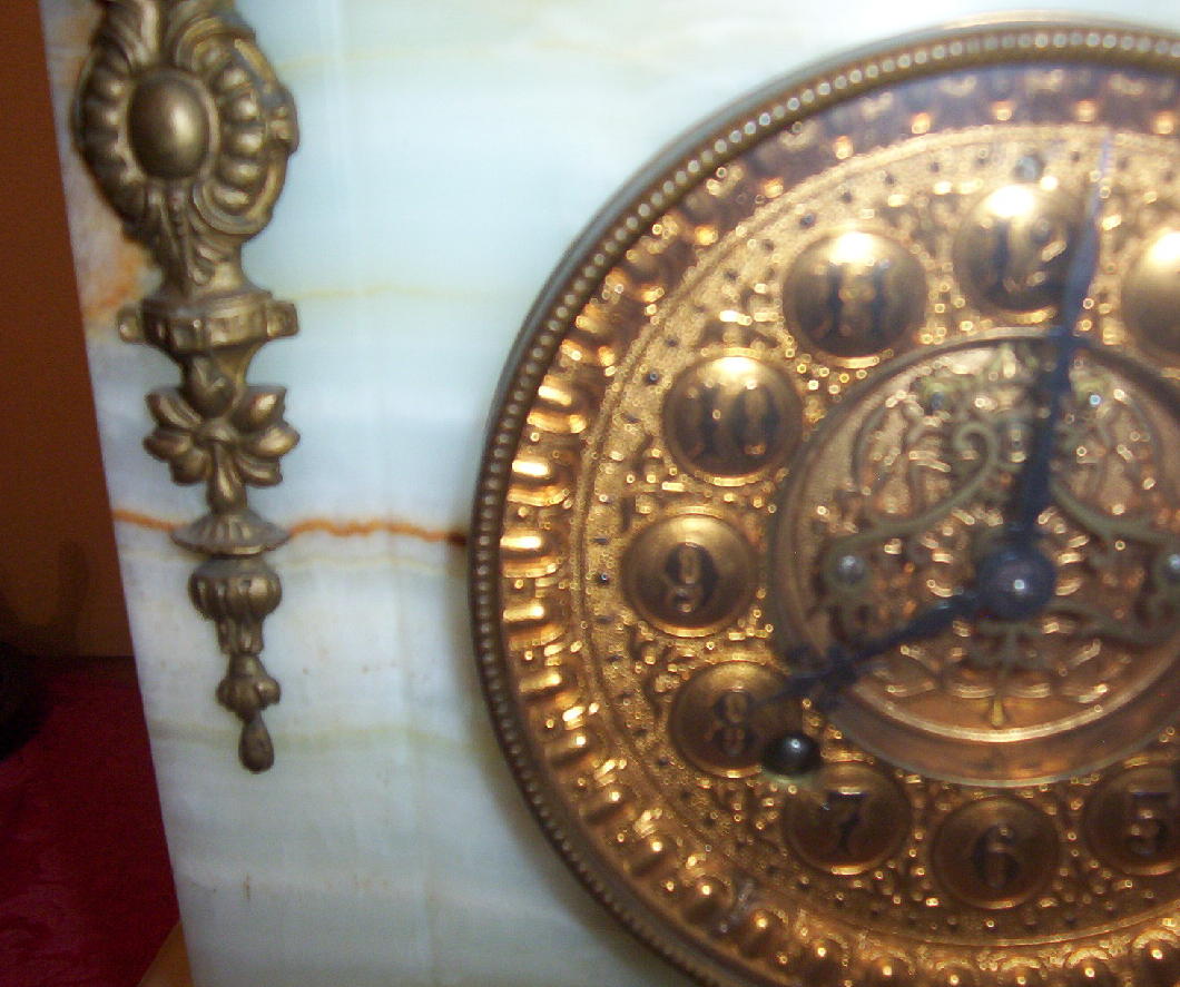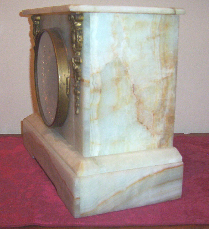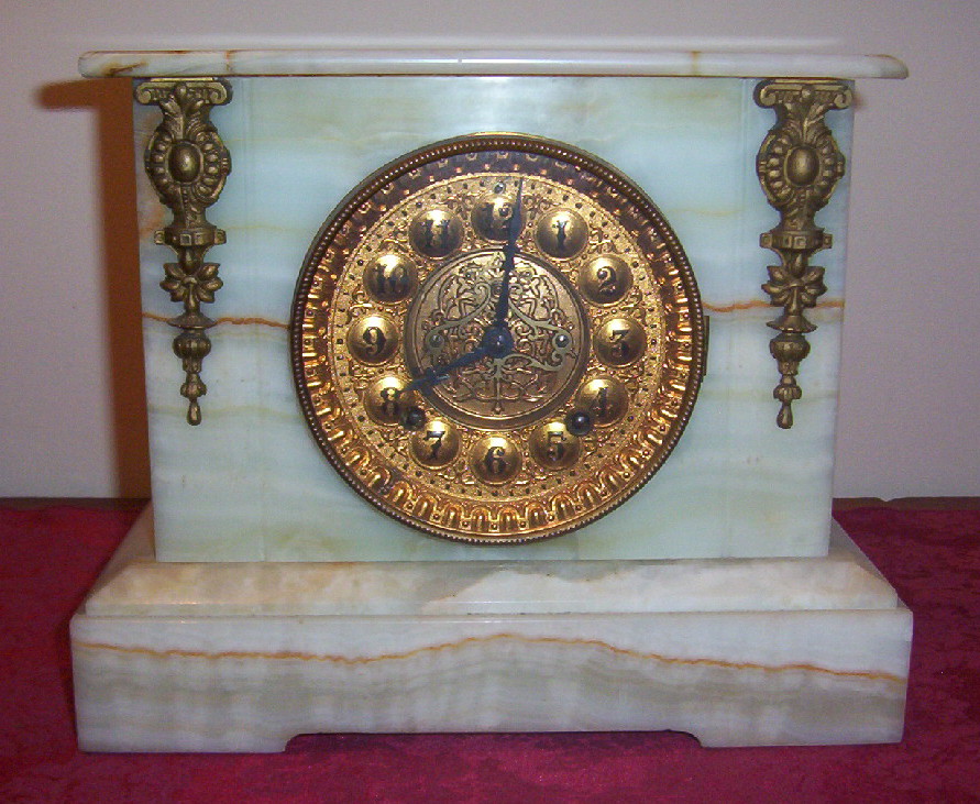 Classic Gilbert Marble Mantle clock. White Veined marble. Made By Gilbert and Co, an American clock Company. Chimes on a Gong, once on the half hour and Counts the hours. Dial and bezel in good condition. In good running order.