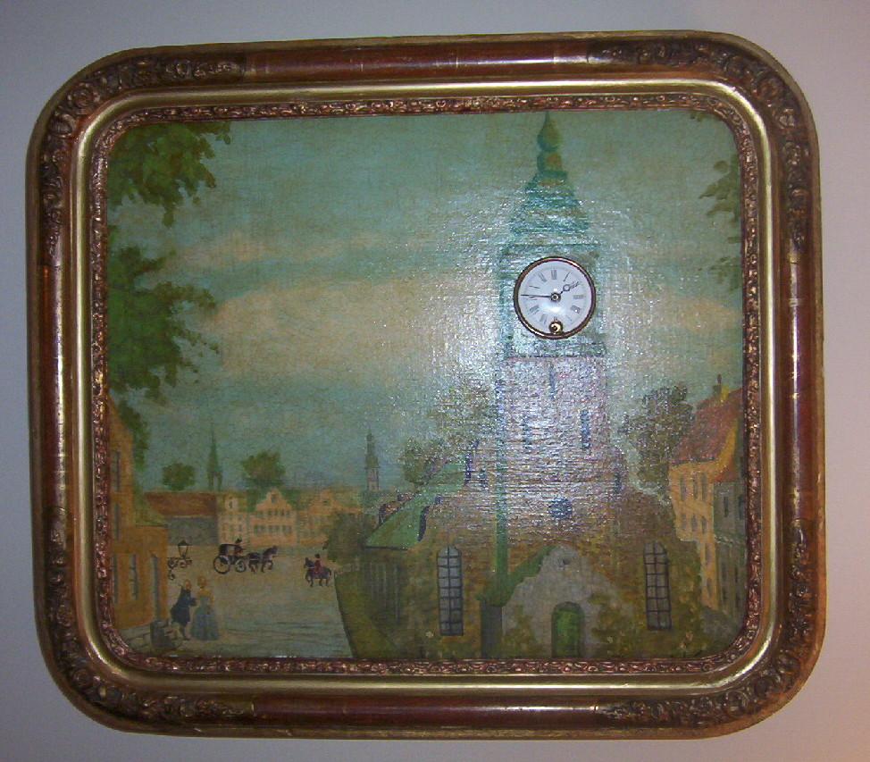 The painting is an European village with Victorian dressed people and a neat Clock tower.